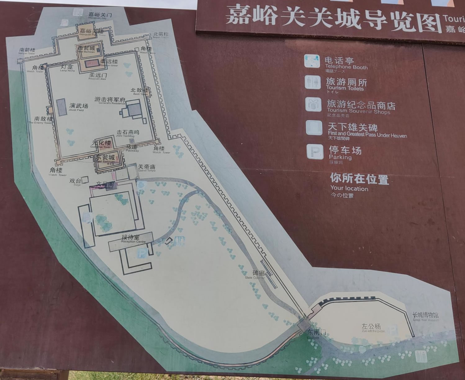 關(guān)城周長(zhǎng)733米。關(guān)城正中有一官井,舊有亭,今已廢。西門外套筑一道凸形城墻,構(gòu)成一個(gè)羅城,這就是外城。外城比內(nèi)城高2.7米。外城正中大門額刻“嘉峪關(guān)”三個(gè)大字。門頂原有城樓,與東西二樓形制相同,三樓東西成一線。民國(guó)十三年(1924年)城樓被毀。西面羅城磚砌,東、南、北有土筑圍墻,連接長(zhǎng)城。城外有城,迭門重城,成并守之勢(shì)。東甕城外有文昌閣、關(guān)帝廟、戲樓,城內(nèi)靠北有游擊衙門府一座,都是清代建筑。新中國(guó)成立后,關(guān)城曾多次維修加固,保存完好。