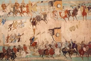 敦煌作為中西交通的樞紐,在壁畫上不僅留下了商旅來往的活動(dòng)情況,還留下了寶貴的交通工具的形象資料。他們有牛馬駝騾、驢象舟船、車轎輿輦等。常用的交通工具車輛類型各異,牛車有“通牛車”、“偏牛車”、敞篷牛車,馬車有駟車、駱車,還有駱駝車、童車、獨(dú)輪車等,特別是保存了中國為世界交通做出獨(dú)有貢獻(xiàn)的獨(dú)輪車、馬套挽具(胸帶挽具和肩套挽具)、馬蹬、馬蹄釘掌等珍貴的圖像數(shù)據(jù)。西魏第285窟、北周第296窟五百盲賊皈依故事畫,表現(xiàn)了騎著戰(zhàn)馬的騎兵,與身穿褲褶的步兵(強(qiáng)盜)作戰(zhàn)的場(chǎng)面,畫面上畫出了馬鎧,它是保護(hù)戰(zhàn)馬的防護(hù)裝備,古稱具裝,或具裝鎧。第285窟馬鎧的形制齊全,從保護(hù)馬頭的“面簾”、到保護(hù)馬鞍后尻部的“寄生”一應(yīng)俱全。反映了漢代已有的具裝,到北朝時(shí)期已發(fā)展為玩唄成熟的保護(hù)裝備。馬鎧的產(chǎn)生和發(fā)展是中國為世界軍事裝備所作的獨(dú)有貢獻(xiàn)。