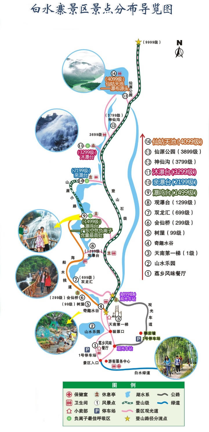 白水寨圍繞白水仙瀑及奇峰秀色,建有9999級登山步徑,總長6.6公里,19000多步,橫跨三座高山,邊接二大天池,號稱“天南第一梯”,取“勝境尋仙”、“悠閑怡景”、“知難而上”、“勇士進取”、“登高攬勝”和“登峰如愿”之義,分“尋仙、怡景、知難、攬勝、勇士和登峰”六段梯,拾級而上盡覽天南第一梯奇觀,盡享休閑健身觀光之樂,百般風情皆可體驗。走過六段梯,登上9999,心想事成,強身健體,六六大順,長長久久。