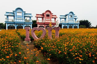 三座粉、藍(lán)相間的巨型迪斯尼風(fēng)格門樓,一片橙色的仙女花在陽光恬靜地流敞著。七個巨型的氣球“串”綻放繽紛色彩,邊上還圍著精美的花柱。香格里拉,正如其名,有著一種永恒、和平、寧靜的 “世外桃源”。