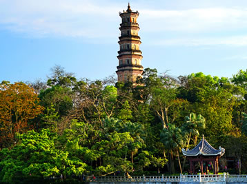 泗洲塔位于廣東惠州西湖西山,是湖上最古老建筑物。始建于唐中宗年間,為紀(jì)念泗洲大圣僧伽而筑,北宋文學(xué)家蘇軾謫居惠州時稱之為大圣塔。明嘉靖四十三年(1564年)塔毀,明萬歷初年改建亭,明萬歷四十六年(1618年)復(fù)建塔。光緒初年,雷破塔頂一角,長了一株榕樹,清代愛國詩人丘逢甲詩云:“行人欲問朝云墓,看取亭亭塔頂榕”。山上綠樹成蔭,亭廊排映,景色秀麗。蘇東坡寫的《江月五首》“一更山吐月,玉塔臥微瀾”的著名詩句指的正是此塔。泗洲塔明代后建至今,已有整整403年古老歷史,是惠州現(xiàn)保存最完善古老的珍貴建筑物之一;葜葶糁匏粡V東省人民政府批準(zhǔn)并公布為第八批廣東省文物保護單位。