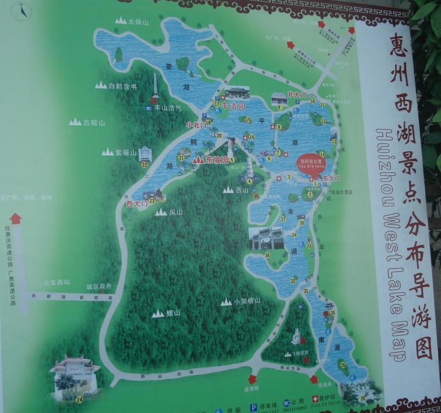 其山川秀邃、幽勝曲折、浮洲四起、青山似黛,古色古香的亭臺樓閣隱現(xiàn)于樹木蔥蘢之中,景域妙在天成,有“苧蘿西子”、“嶺南明珠”之美譽,并有“大中國西湖三十六,唯惠州足并杭州” 的史載。歷代以蘇東坡、李商隱、楊萬里、祝枝山、陳堯佐、白玉蟾、梁鼎芬、丘逢甲為代表的400多位文人墨客曾踏足惠州,為西湖留下了寶貴的文化遺產(chǎn);近代孫中山、周恩來等領(lǐng)導(dǎo)人在惠州從事過革命運動,在西湖留下了光輝的足跡。這些歷史古跡和革命勝跡與西湖的青山秀水融為一體,相得益彰。