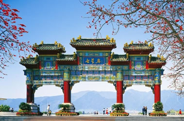 肇慶七星巖牌坊,在肇慶星湖最南面,即現(xiàn)牌坊廣場正前方,下有寬闊的大理石平臺(tái)和臺(tái)階式步級(jí),前面與端州路交界,正對繁華的天寧北路,后面是寬闊的廣場與浩瀚似海的星湖。1959年落成,鋼筋混凝土仿古建筑,高12米,寬17.5米,四柱三間,柱礎(chǔ)花籃形,四根大圓柱飾以朱紅,仿歇山頂,上蓋琉璃瓦,中門上方鑲嵌著朱德于1959年手書的“七星巖”三個(gè)大字,為肇慶的重要標(biāo)志物。