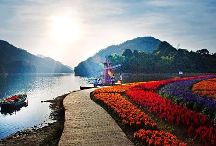 “夏日花!笔鞘铒L光區(qū)的天池花海景點的夏日特色花海,位于海拔800多米的石灶天池之畔,面積近百畝!跋娜栈ê!庇苫鸺t燦爛的一串紅、花中之禽雞冠花、英雄之花紅穗冠、香草之后薰衣草組成,與原始次生林、水生植物園和天池編織出一幅如童話世界般的美麗畫卷。特別是單一紫色花朵代表真愛的薰衣草,總是能讓人聯(lián)想到溫馨的浪漫。