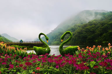 “七彩天池”花海是石灶風光區(qū)的天池花海景點國慶期間的一個特色,由多種顏色的花卉共同組成。大紅色的一串紅、金黃色的硫化菊、紫色的千日紅、橙色的百日草、深紅色的紅穗冠、淡黃色的黃穗冠和粉色的朱唇等匯聚成一道亮麗的彩虹,降落在藍天碧水之間,創(chuàng)造出一個七彩斑斕的童話世界。同時,圍繞著這七色花海還有大波斯菊與醉蝶花。紅的,粉的,紫的,白的小花配以音樂等元素造型共同點綴著這幅優(yōu)美的畫卷。“七彩天池”最佳觀賞期為9-11月。