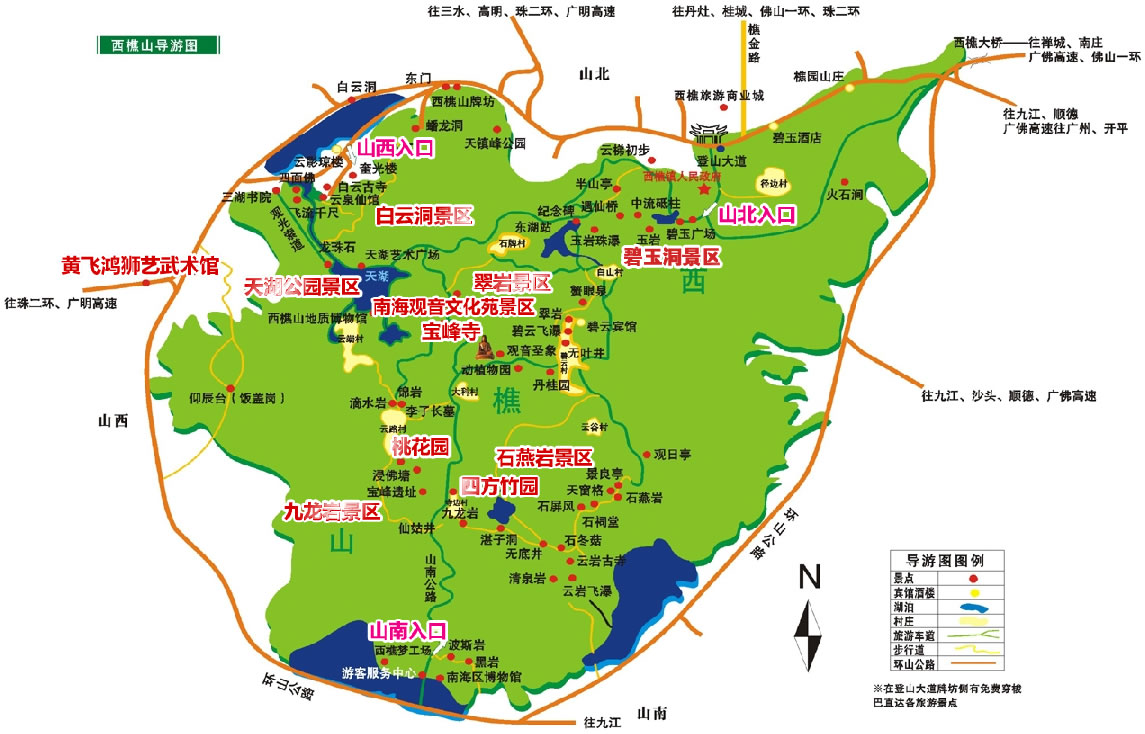 西樵山是一座沉寂了億萬年的死火山,自然風光美不勝收,山上有72奇峰和36奇洞及大大小小的湖泊、泉瀑和深潭;由于西樵山林深苔厚,儲存了極為豐富的水資源,因而被稱為“固體水庫”。整個包括石燕巖、 作為“珠江文明燈塔”的西樵山有著6000多年的文明史,古西樵山人創(chuàng)造了燦爛的“雙肩石器”文明;到明清期間,有大批的文人學子曾隱居在這里,使西樵山獲得了“南粵理學名山”的雅號;西樵山還是“南拳文化”的發(fā)源地,一代宗師黃飛鴻就出生在這里;西樵山民風淳樸、古韻猶存,到這里來旅游,還能觀賞到山里百姓的婚嫁、生產(chǎn)習俗以及各種民間游藝活動。