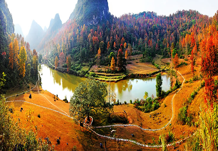紅葉森林公園位于德?h東北側方向,國家AAAA級旅游景區(qū)暨自治區(qū)級森林公園,距縣城3.5公里,交通便利。公園規(guī)劃面積1036.5公頃,該公園核心景區(qū)為紅楓湖游覽區(qū)和紅葉谷游覽區(qū),以紅楓為主題。金秋時節(jié),楓葉似火,湖水輕柔,互襯互耀,頗具詩情畫意。公園的紅葉品種主要以楓香為主,葉子顏色分別有深紅、絳紅、霞紅、黃紅混合等,觀賞時間較長,有著“德保楓葉賽九寨”的美譽,是秋季里一道亮麗的風景線。公園以紅楓湖、紅葉谷一帶的紅楓林為依托,襯托著多姿多彩的紅葉森林景觀、森林生態(tài)景觀、底蘊深厚的人文景觀和綺麗迷人的水文景觀,將紅楓湖、上章湖、紅葉谷構成休閑避暑游覽的大旅游圈,景區(qū)內(nèi)上章水庫和百布水庫交相輝映,總庫容量分別為365萬立方米和190萬立方米;有效灌溉面積分別為2200畝和2000畝。目前,景區(qū)各項基礎設施正在逐步完善。德保境內(nèi)有10萬多畝連片的紅楓林,遍布城關、那甲、馬隘、巴頭等鄉(xiāng)鎮(zhèn)。除紅葉森林公園外,馬隘至巴頭一線還有許多別具特色的賞楓景點,無一不令人流連忘返。