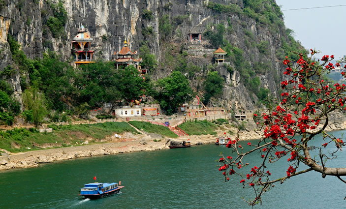 金雞巖位于縣城西北隅,坐落在架山腰間,瀕臨左江,與扶綏中學隔江相望。 [22]主洞面積40多平方米,高4米、內(nèi)設(shè)有金雞娘娘、斑民夫人、花公、花婆、花木蘭等塑像。洞口左側(cè)有伏波亭,右側(cè)有伏波將軍塑像。沿江岸有103級石階通往洞口。金雞巖為明代遺址。相傳金雞娘娘于此修道成正果,故名“金雞巖”。明代著名地理學家、旅行家徐霞客留下“三誤三返”游跡;清代名人劉宅俊在懸崖巖壁上刻鐫著“雞巖帆影”題詞;道光癸卯年記載著李佑會題刻銘詩。