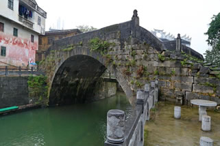 石板路旁的房子多為青磚、青瓦的兩層明清建筑,歷史滄桑隨處可見(jiàn)。每棟房子設(shè)計(jì)十分合理,集商住于一身,均由門(mén)前、天井、正房、廂房、后院組成。靠街的一般作鋪面從事商業(yè),有樓梯可上二層。往里走是天井,一般都栽有花草,利于采光;天井后是正房,高大寬敞,供著神像及祖宗牌位,是主人活動(dòng)、會(huì)客的地方;兩邊是用來(lái)居住的廂房。正房、廂房的門(mén)窗上都雕有花紋;正房后有門(mén)可到后院,后院臨江并建廚房和廁所,有石階可到江邊取水、洗衣。到大圩,萬(wàn)壽橋是必去的地方。萬(wàn)壽橋詩(shī)建于明代,是一座石塊砌起的石拱橋,橋面的石頭已被磨得溜光發(fā)亮,間雜些許小草,古樸自然。橋的西面是漓江,是欣賞漓江及對(duì)岸螺螄山的極佳位置。