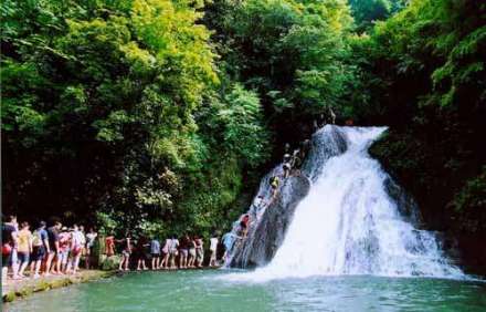 瀑布源頭比漓江水面高出180米,是我國(guó)唯一一個(gè)由地下涌泉形成的多級(jí)串連瀑布;是一個(gè)因鈣華沉積作用可逐漸長(zhǎng)高而改變景致的瀑布。八級(jí)瀑布形態(tài)各異,有的如鴛鴦戲水,有的如蛟龍噴水,有的懸于長(zhǎng)滿青苔的巖壁上,瀑水如布,水紋清晰可鑒,呈白色透明狀,猶如噴霧行云;有的水流集中下注跌入深潭濺起層層水霧浪花,猶如細(xì)雨蒙蒙,瀑布兩岸林木蔥郁,蔭蔽幽靜,水質(zhì)清洌,涼爽甘甜。山腳亞熱帶雨林濃郁,藤蔓垂壁,叢林險(xiǎn)徑,三千多畝的楓樹(shù)和馬尾松,風(fēng)吹林動(dòng),鳥(niǎo)語(yǔ)花香,令人有回歸自然的親切感。到了深秋時(shí)節(jié)的紅楓更是別一番“霜林盡染,漫山紅遍,紅葉鋪滿山徑”的美景。