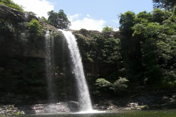 應(yīng)天瀑布在十萬(wàn)大山掃把山下,瑤寨念文屯西南3千米的山谷中。瀑布落山外,巖板稍平闊,水口呈“凹”狀,飛瀑處壁形,高28米,巖壁間有一凹處;深寬均數(shù)米,形似“水簾洞”。春夏大雨,山洪暴發(fā);瀑布響聲如雷,數(shù)里外還震人耳膜,“應(yīng)天泉”由此而名。瀑下數(shù)十米,巨石如象;沉列溪中,同一溪流,距此瀑布約百米和二百米處,還有兩處小瀑布,高度均約十余米,當(dāng)?shù)厝朔Q(chēng)應(yīng)天瀑布為“頭龍”,下面小瀑布為“二龍”和“三龍”。