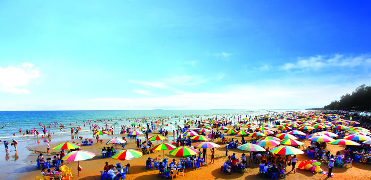 金灘,位于京族萬(wàn)尾島的南邊,全長(zhǎng)13公里,與越南的風(fēng)景名勝區(qū)萬(wàn)柱島隔海相望。金灘沙細(xì)、坡緩、水清、浪平,且無(wú)海藻、無(wú)鯊魚、無(wú)污染。沙灘由海岸緩緩斜入海中,是集陽(yáng)光、沙灘、海水于一身的天然“三·S”海濱浴場(chǎng)。岸上有20多公里長(zhǎng)的椰樹(shù)、木麻黃觀光林帶。金灘空氣氧離子含量是內(nèi)陸城市的500~1000倍,最高氣溫33℃、最低氣溫6℃,年平均氣溫在20℃~23℃之間。