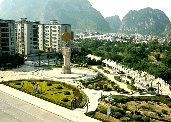 地形 金城江區(qū)系云貴高原余脈地帶,地勢(shì)自西北向東南傾斜,一般海拔為400-600米,最高海拔為1114米。屬桂西北邊陲要地,全境東西長(zhǎng)68千米,南北寬62千米,總面積2340平方千米,耕地面積23.5萬(wàn)畝。