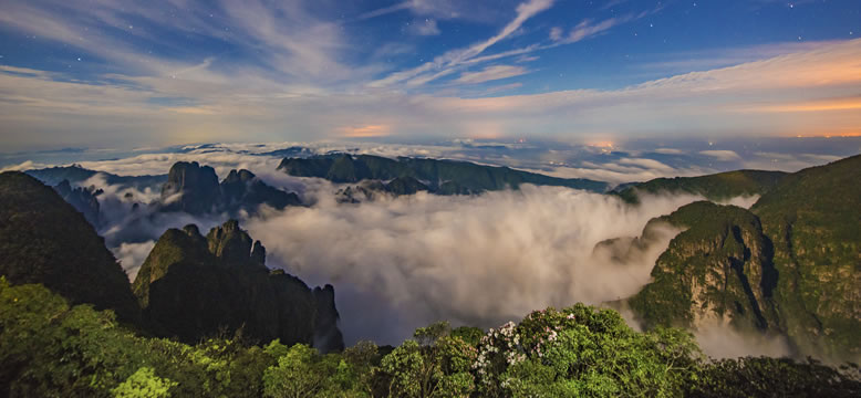 圣堂山景區(qū)位于金秀縣城南面,距金秀縣城38公里,距柳州市區(qū)134公里,距桂林市區(qū)210公里,距南寧市區(qū)329公里,距來(lái)賓市區(qū)224公里,景區(qū)面積約120平方公里,山體結(jié)構(gòu)架由7座海拔1600米以上巍峨奇異的群峰組成,主峰海拔1979米,為桂中第一高峰、廣西第五高峰。圣堂山山體龐大、崎嶇陡峭、怪石嶙峋,山上神奇秀麗的萬(wàn)畝變色杜鵑林,變幻莫測(cè)的云海迷霧,奇松怪樹(shù),古樸原始,自然生態(tài)優(yōu)良,物種豐富,森林覆蓋率達(dá)95.6%,具有雄、奇、險(xiǎn)、秀、古、野等獨(dú)特景觀特色。 景區(qū)小氣候特征明顯,氣象瞬息萬(wàn)變、幻化莫測(cè),負(fù)氧離子含量最高達(dá)138000個(gè)每立方厘米,年均氣溫17℃左右,冬暖夏涼,是華南不可多得的避暑勝地和自然景觀,是最受瑤山人民推崇的“圣山”。景區(qū)先后獲評(píng)國(guó)家森林公園、國(guó)家級(jí)自然保護(hù)區(qū)、國(guó)家AAAA級(jí)旅游景區(qū)、中國(guó)森林旅游美景推廣地,自治區(qū)級(jí)生態(tài)旅游示范區(qū)自治區(qū)級(jí)森林康養(yǎng)基地等稱號(hào)。