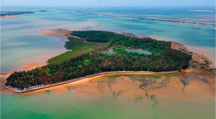 平山島,坐落在欽州城的南面,四面環(huán)水,與市區(qū)一水相隔土地平坦,林豐草茂,臨海的一面又突兀一座山峰,風(fēng)光旖旎,景色秀麗?滴鯉X標(biāo)準(zhǔn)海堤,全長三十多千米, 號稱廣西第一堤,俗稱“海上長城”。