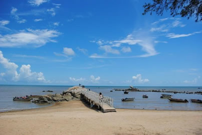 三娘灣沿岸月亮沙灘長約1.5公里,掩映在欏麻防風(fēng)林中的海灘呈金黃色,松軟細(xì)膩;緊傍三娘灣的漁村里雞鳴犬吠,炊煙裊裊,讓人領(lǐng)略到與都市旅游迥然不同的野趣。