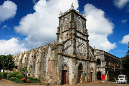 圣堂景區(qū)位于潿洲島盛塘村,是全國重點文物保護單位,“晚清四大天主教堂”之一。教堂由法國巴黎外方傳教士建于1853年,歷時10年建成,主體建筑保存較為完好,是中西文化融合共生的歷史見證。整座建筑主要取材于海底珊瑚沉積巖,運用周密的力學設計建成,是典型的文藝復興時期法國哥特式教堂,外表高聳的羅馬式尖塔有著“向天一擊”的動勢,造成一種“天國神秘”的幻覺,堪稱別具一格。