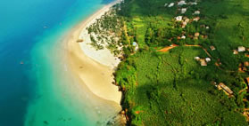 潿洲島的南半部以海蝕地貌為主,無論是海蝕崖、洞,還是海蝕臺、柱發(fā)育得很成熟;北半部則以海積地貌為主,有沙堤、渲湖、沙灘及礁坪。在海蝕地貌中又以南灣沿岸為典型。南灣原是一南邊破口的火山凹地,被海水淹沒形成海灣,其周圍是火山沉積巖。在海浪和潮汐的交相侵蝕下,潮間帶附近的巖石首先遭到破壞,便形成了呈層分布的海蝕洞穴,而洞穴上部的巖石失去支持后沿垂直節(jié)理斷裂或崩潰下來,于是又形成陡峭的海蝕崖。東、西拱手間近5公里長的海灣上布滿這種海蝕崖,它們高度在30~50米之間,坡度大于75°。