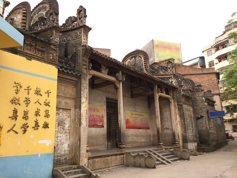 北流粵東會館位于今北流市城區(qū)永安路一里9號。始建于清乾隆二十年(1755年),建筑坐西向東,原規(guī)模為三進兩廂兩天井一戲臺,占地面積1400平方米,現(xiàn)僅存兩進一廂,占地面積642.6平方米。硬山頂磚木結(jié)構(gòu),鑊耳山墻,小青瓦屋面、青磚墻,抬梁穿斗式混合梁架。屋脊灰塑雙龍戲珠及博古紋,前座檐墻及廂房墻端堆砌陶瓷樓閣人物圖,檐廊柱間梁以石獅如意云柁墩作承重,三根枋墩雕刻人物及如意云紋,雀替透雕吉祥紋飾。中座內(nèi)有4根花崗巖石柱支撐屋頂。庭院及通道均鋪設(shè)紅色階磚和花崗巖條石。
