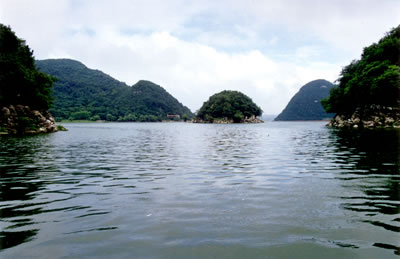南湖的面積最大,景點(diǎn)也最多,南湖以洞多洞奇揚(yáng)名。首先映入眼簾的,是一組奇目的山巖壁石,這是小巧瓏?yán)识痔烊恍纬傻摹芭杈吧健。這里的石頭色彩特別豐富,青灰和棕黃的頁巖直插入碧水之中。大湖面逐漸狹窄,這兩邊的巖岸,如同斧劈劍削,有些游人把它呼為“小三峽”;這一片景觀石峰林立,如同到插的刀劍,給秀美的湖水增添幾許陽剛之氣,人們把它稱為“小石林”;這里的巖石,別有風(fēng)姿,它橫看不成嶺,側(cè)看不成峰,一片又一片向上堆積,有如卷幟浩繁的典籍,人們把它稱為“峭壁天書”。