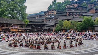 每天上午和下午各有一場由西江千戶苗寨苗族同胞表演的民族歌舞節(jié)目,苗族人表演的歌舞節(jié)目有當(dāng)?shù)氐纳剩A麗的服飾、歡快的歌舞和美麗的愛情故事。苗族古歌演唱,演唱者全是寨中的老人,用苗族古語演唱其史詩般宏大的古歌(苗族古歌有四部分,涵括萬物起源、天地洪荒及辛酸遷徙史等)。遇到特別活動(dòng)或是有重要人物出現(xiàn),還是能夠看到掌坳的銅鼓舞、方祥的高排蘆笙、反排的木鼓舞等。