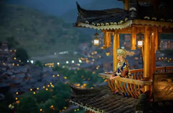 黃昏時(shí)分,西江千戶苗寨千家萬戶就亮起了燈。隨著天色越來越暗,西江千戶苗寨變成燈的海洋,西江千戶苗寨呈現(xiàn)牛頭的形狀。西江千戶苗寨景區(qū)在山坡高處的路邊修建了觀景臺(tái),開通觀光車。