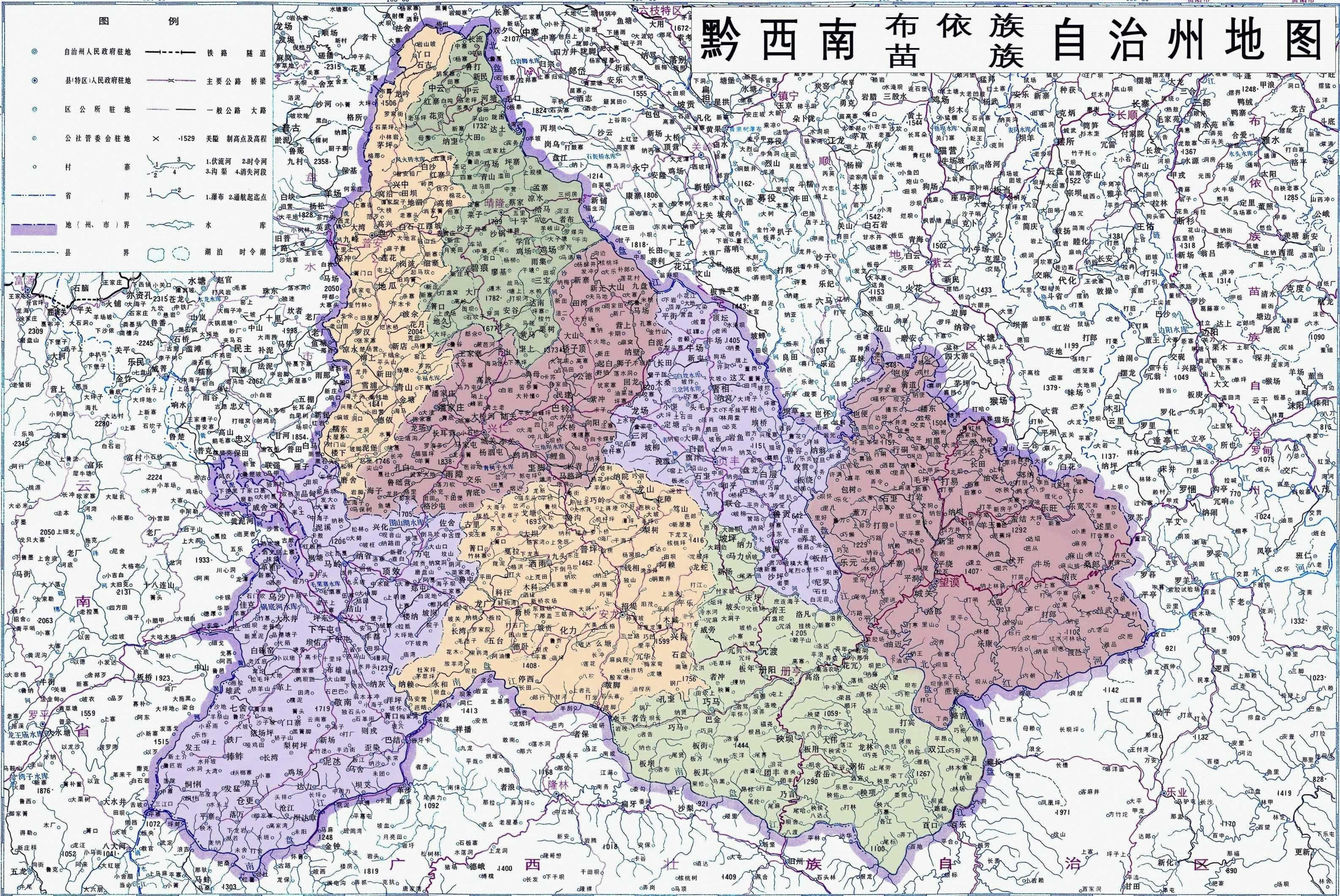 1956年,安龍、冊亨、望謨、貞豐等4縣劃入黔南州,1956年7月18日,撤銷興義專署,所轄興義、興仁、盤縣、普安、關(guān)嶺、晴隆等6個縣劃歸安順專署。1965年1月13日,經(jīng)中央人民政府批準,撤銷貞豐、望謨、安龍、冊亨縣,分別成立貞豐、望謨、安龍布依族苗族自治縣和冊亨布依族自治縣。