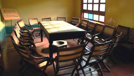 遵義會(huì)議會(huì)址是在二樓東側(cè)的長(zhǎng)方形,客廳面積27平方米,墻上掛著一臺(tái)時(shí)鐘,客廳中央有一褚色長(zhǎng)方桌,周圍有一圈木架藤條折疊靠背椅。西墻是一排玻璃窗,可見遠(yuǎn)處青山和臨街民房。