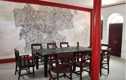 原為房主的小客廳。 會(huì)議室呈長(zhǎng)方形,面積27平方米,室內(nèi)陳設(shè),基本上是當(dāng)年開會(huì)時(shí)的原貌。屋子正中的頂壁上懸掛著一盞荷葉邊蓋的洋員燈,屋子的東壁有一只掛鐘(原物)和兩個(gè)壁柜(原物),其中一個(gè)壁柜上嵌著一面穿衣鏡。西壁是一排軒亮的玻璃窗。屋子中央陳列著一張板栗色的長(zhǎng)方桌(原物),四周圍著一圈木邊藤心摺疊靠背椅,共20只,為出席遵義會(huì)議的人員所坐。長(zhǎng)方桌下有一只燒木炭的火盆,為當(dāng)時(shí)取暖用。