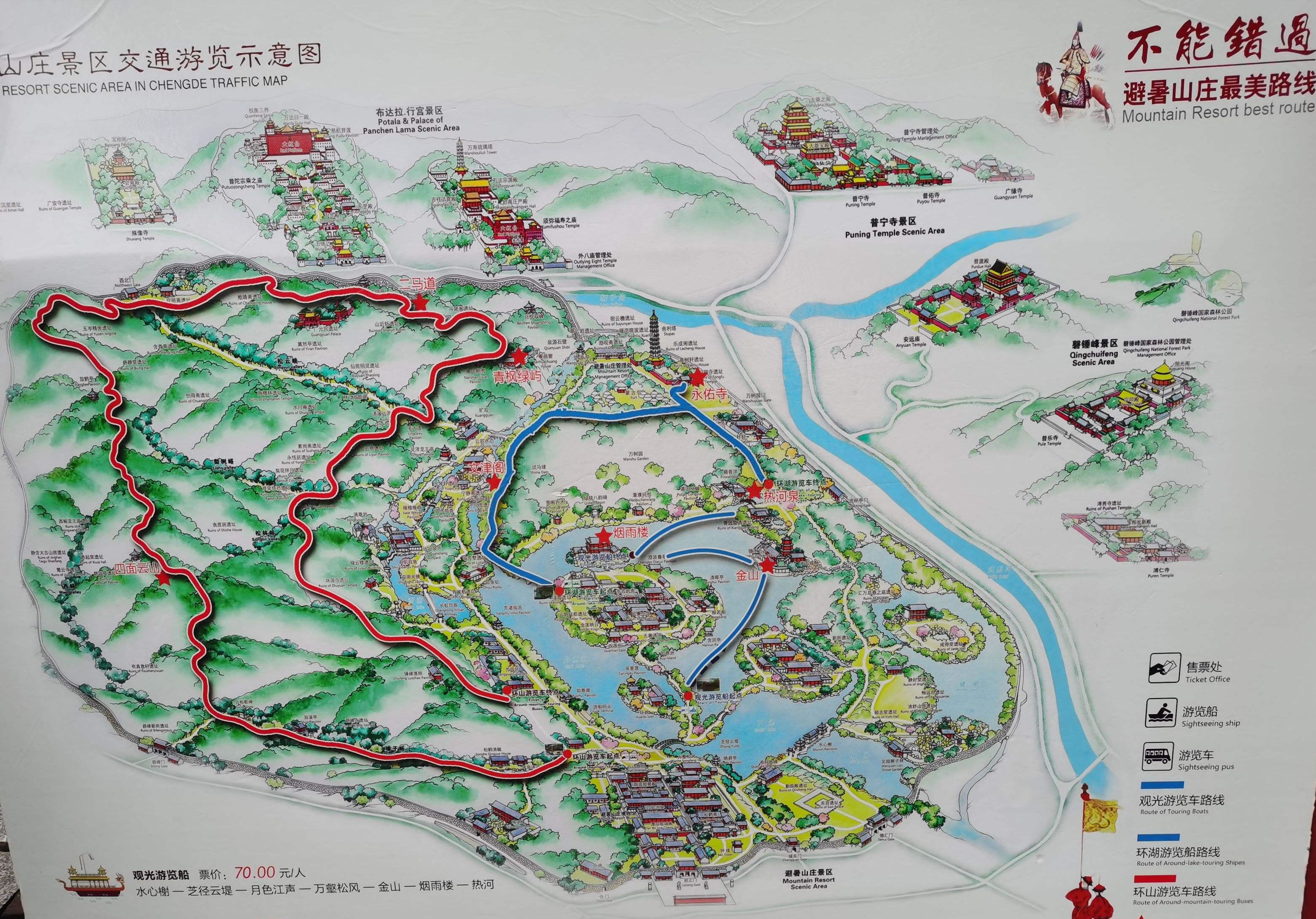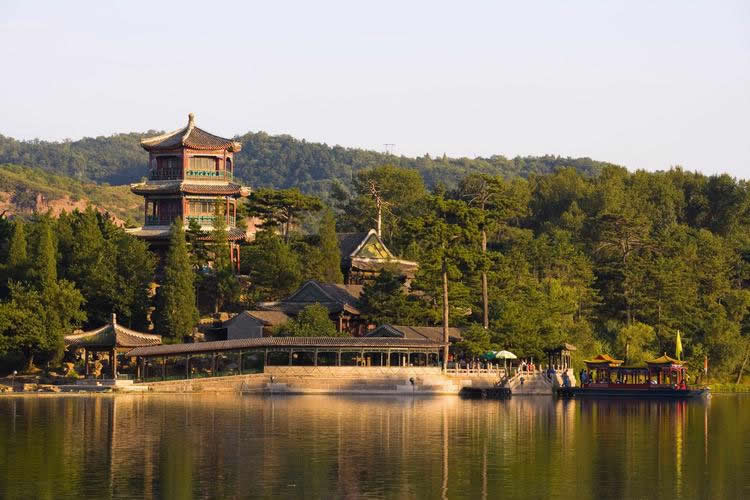 山巒區(qū):位于山莊西北部,面積443.5萬平方米。山區(qū)占了整個園林面積的五分之四。從西北部高峰到東南部湖沼、平原地帶,相對高差180米,形成了群峰環(huán)繞、色壑縱橫的景,山谷中清泉涌流,密林幽深。高聳的山峰好似天然屏障,阻擋了西北寒風(fēng)的侵襲,是調(diào)節(jié)山莊氣候的重要因素。當(dāng)年利用山峰、山崖、山麓、山澗等地形,修建了多處園林、寺廟,共計40余處。