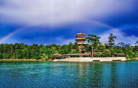 湖泊區(qū):苑景區(qū)的精華基本上在湖泊區(qū),康熙曾夸耀說,“天然風(fēng)景勝西湖”。由于洲島錯落,湖面被長堤和洲島分割成5個湖,各湖之間又有橋相通,兩岸綠樹成蔭,山莊主要的風(fēng)景建筑又都散落在湖區(qū)的周圍,因此顯得曲折有致,秀麗多姿。湖泊區(qū)位于山莊東南,面積49.6萬平方米。有大小湖泊八處,即西湖、澄湖、如意泅、上湖、下湖、銀湖、鏡湖及半月湖,統(tǒng)稱為塞湖。 湖區(qū)的風(fēng)景建筑大多是仿照江南的名勝建造的,如“煙雨樓”,是模仿浙江嘉興南湖煙雨樓的形狀修的。金山島的布局仿自江蘇鎮(zhèn)江金山。湖中的兩個島分別有兩組建筑,一組叫“如意洲”,一組叫“月色江聲”!叭缫庵蕖鄙嫌屑偕、涼亭、殿堂、廟宇、水池等建筑,布局巧妙,是風(fēng)景區(qū)的中心!霸律暋笔怯梢蛔碌乃暮显汉蛶鬃、堂組成。每當(dāng)月上東山的夜晚,蛟潔的月光,映照著平靜的湖水,山莊內(nèi)萬籟俱寂,只有湖水在輕拍堤岸,發(fā)出悅耳的聲音,“月色江聲”的題名便是由此而來。湖泊區(qū)集南方園林之秀和北方園林之雄,將江南園林的景觀移植到塞外。區(qū)內(nèi)湖泊總稱“塞湖”,總面積57公頃。
