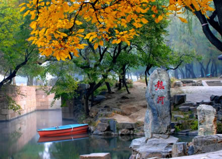 熱河泉位于山莊湖區(qū)東北隅,是山莊湖泊的主要水源。清澈的泉水從地下涌出,流經(jīng)澄湖、如意泅、上湖、下湖,自銀湖南部的五孔閘流出,沿長堤匯入武烈河。熱河全長700多米,在一般地圖上找不到它有蹤跡。它是中國最短的河流。熱河發(fā)源于避暑山莊諸泉的一條涓涓細(xì)流,主要水源來自熱河泉。冬季水溫為8℃。泉側(cè)有巨石,刻“熱河”兩字。