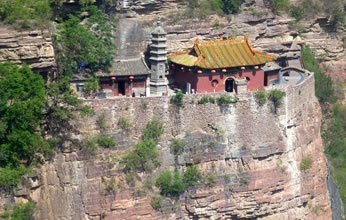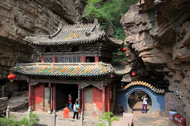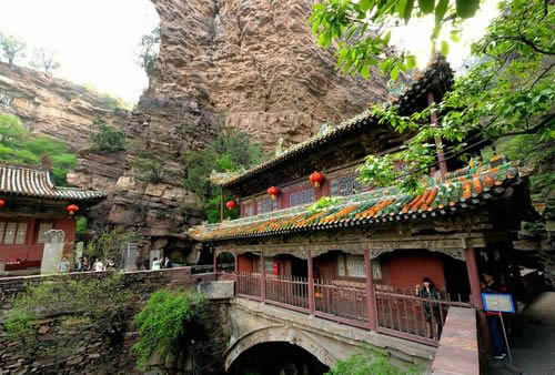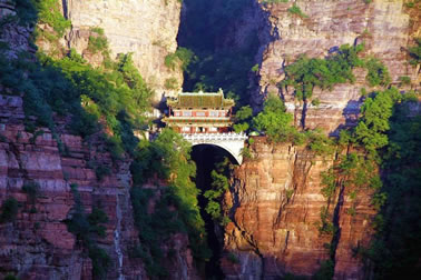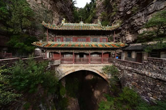 一絕“橋樓殿”。橋凌駕于百仞峭壁之間,仰視藍天一線,俯首萬丈深淵。形制如同趙州橋敞肩拱式。橋上建樓,云飛樓動,樓內建殿,殿內三尊大佛。真是“千丈虹橋望入微,天光云彩共樓飛”,不是仙境勝似仙境,疑是天堂落塵!,F為中國三大懸空寺之一。