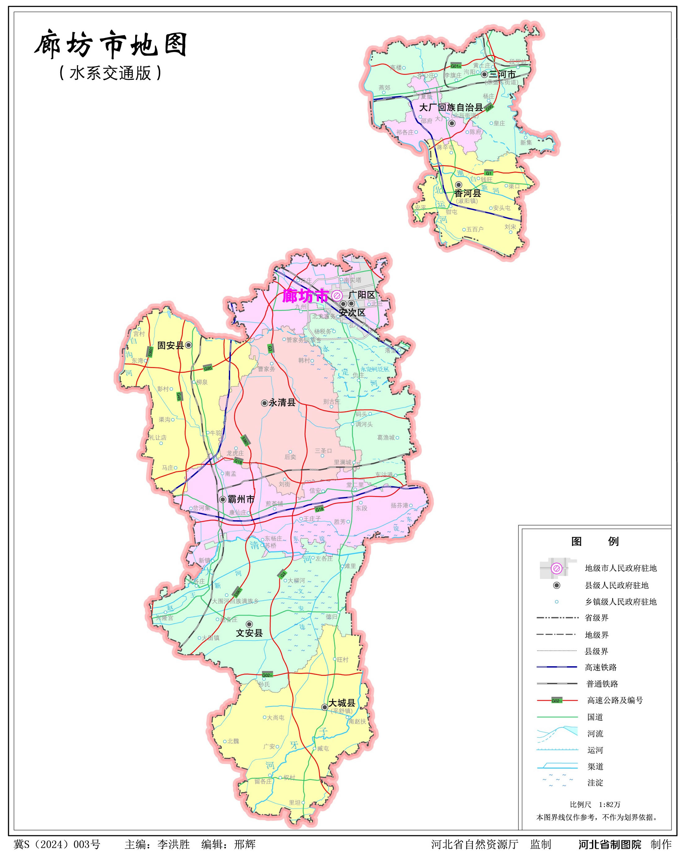 廊坊市轄2個市轄區(qū)、5個縣、1個自治縣,代管2個縣級市: