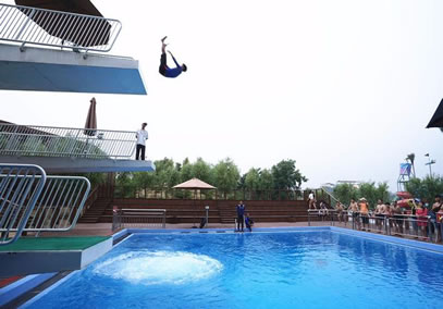新增項(xiàng)目: 高空氣泡跳水。景區(qū)引進(jìn)德國(guó)的凈水裝置和氣泡裝置,通過氣泡裝置降低水密度,減少入水時(shí)游客承受的壓力,降低安全風(fēng)險(xiǎn),設(shè)置了距離水面1m、3m、5m三種高度的跳臺(tái)。