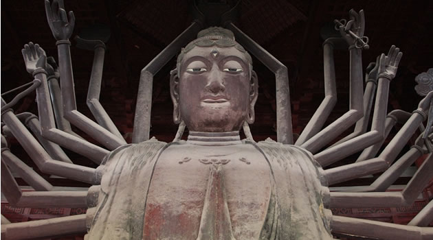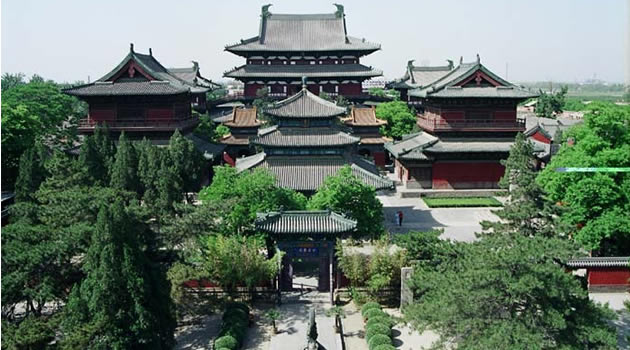 隆興寺:位于石家莊市正定縣縣城,是國內(nèi)現(xiàn)存時代較早、規(guī)模較大而又保存完整的佛教寺院之一。隆興寺始建于隋開皇六年(586年),原名“龍藏寺”。宋初,太祖祖趙匡胤敕令在龍藏寺內(nèi)鑄造銅佛,并蓋大悲閣,遂大興土,以大悲閣為主體的一組宋代建筑先后告成。到了清康熙、乾隆年間,又兩次大規(guī)模維修和增建,寺院發(fā)展到鼎盛時期。清康熙四十八年(1709),改龍藏寺為隆興寺,俗稱大佛寺。 隆興寺這座千年古剎,歷代帝王曾多次到此巡境幸駐蹕,上香禮佛,題詩書匾,刻碑立石。可見當年這里晨鐘暮鼓,鐘磬齊鳴,香煙繚繞,“南無”聲聲的歷史盛況。大悲閣是隆興寺的主體建筑,五檐三層,高33米。閣內(nèi)正矗立著高大銅佛鑄像,這就是名聞遐邇的正定大菩薩。這尊千手千眼觀音菩薩像有22.28米高,有42臂分別執(zhí)日、月、凈瓶、寶杖、寶鏡、金剛杵等法器。面部情端祥恬靜,仁慈莊重。達到了瞻之彌高、仰之益恭的藝術(shù)效果。