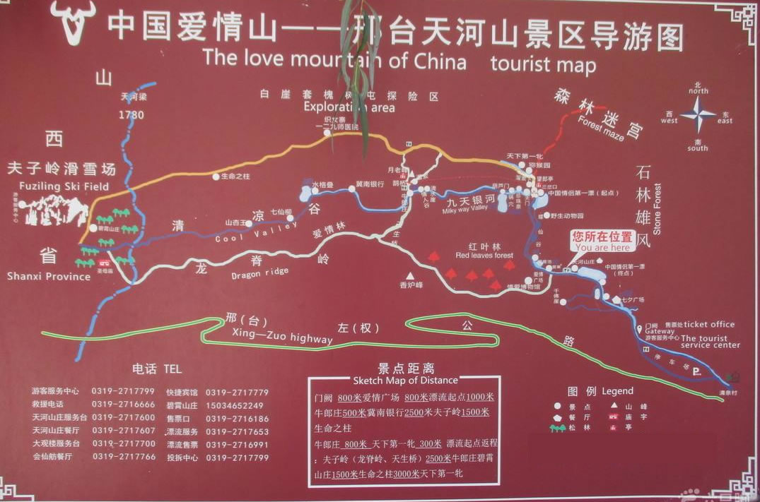 天河山停車場→天河湖大壩→漢闕大門→愛情廣場→摩訶池→蝶仙谷→山神廟→凌波湖→凌雪湖→九天銀河→天門→珍珠泉→串珠壺穴→(十八盤)→香溪潭→紅河谷→一線天→情人谷→滴水崖→綠色長廊→冀南銀行舊址→姐妹柳→云頂草原→原始次生林→龍脊嶺→下山