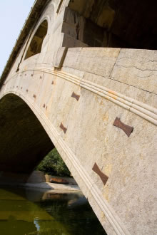 每一拱券采用”下寬上窄、略有收分“方法,使每個拱券向里傾斜、相互擠靠,增強(qiáng)其橫向聯(lián)系,防止拱石向外傾倒;在橋的寬度上也采用”少量收分“方法,從橋兩端到橋頂逐漸收縮橋?qū)挾,加?qiáng)橋的穩(wěn)定性。