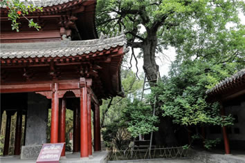 二程手植槐,樹高19.5米,圍粗4米。雖然樹干嶙峋,中空外實,槐冠卻叢撥陰濃,新枝簇簇,樹姿優(yōu)美,老而不衰。相傳為北宋理學(xué)名家程顥到嵩陽書院講學(xué)時親手所栽。