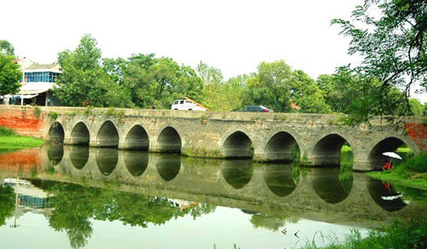 老城九孔橋:自明弘治十年(公元1497年)到建國(guó)后的1950年10月老城鎮(zhèn)一直是沈丘縣治所所在地,城南緊靠東西流向的泉河,當(dāng)時(shí)河寬水深,各種貨物可上通漯河,下達(dá)臨泉、潁州(現(xiàn)阜陽(yáng)市),經(jīng)潁上至正陽(yáng)入淮河,當(dāng)時(shí)是一條繁盛的“黃金水道”。但城南無(wú)橋,南北兩岸大量人員來(lái)往,貨物運(yùn)送,全靠船渡,因水大、人多、貨物超載或遇急風(fēng)惡浪,每年都有事故發(fā)生。1973年、1981年沈丘縣人民政府兩次撥款4.1萬(wàn)元,維修九孔橋。因九孔橋是周口至臨泉的主要交通干道,經(jīng)常有幾十噸的大貨車(chē)在橋上行駛,常年承受著交通重載,所以到1998年南橋頭西側(cè)倒塌了十幾米,致使車(chē)輛無(wú)法行走。1999年,沈丘縣人大代表、老城東升布鞋廠(chǎng)廠(chǎng)長(zhǎng)郭傳興個(gè)人出資5萬(wàn)元,南關(guān)行政村支部書(shū)記張連營(yíng)負(fù)責(zé)施工補(bǔ)修,把橋加長(zhǎng)4米,全橋長(zhǎng)達(dá)99米,19天后竣工,F(xiàn)橋體基本完好,車(chē)輛行人稱(chēng)便。