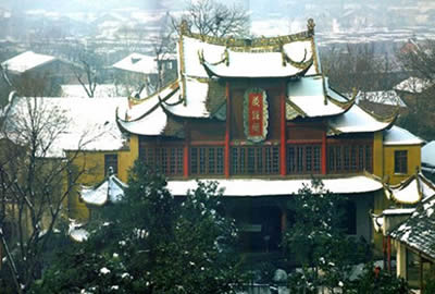 北院的主體建筑是藏經(jīng)樓。藏經(jīng)閣1920年至1922年興建,是一座兩層五開問的樓閣式建筑,高約25米,頂為獸頭大脊,魚角搬爪,斗拱飛檐,古樸玲瓏,當面為四柱通天,雙鳳朝陽,五龍戲珠。整個建筑、門扇窗牖,涂朱繪彩,刻畫鏤雕,精巧壯觀,金碧輝煌,是武漢市唯一一座磚木結(jié)構(gòu)的古建筑物。這里珍藏著許多佛教文物,除《藏經(jīng)》外,還有佛象、法物、石雕、木刻、書畫碑帖及外文典籍等。