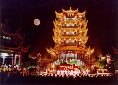 號稱江南三大名樓之一的黃鶴樓,原址在湖北武昌蛇山黃鶴磯頭,原為辛氏開設的酒店,一道士為了感謝她千杯之恩,臨行前在壁上畫了一只鶴,告之它能下來起舞助興。從此賓客盈門,生意興隆。過了十年,道士復來,取笛