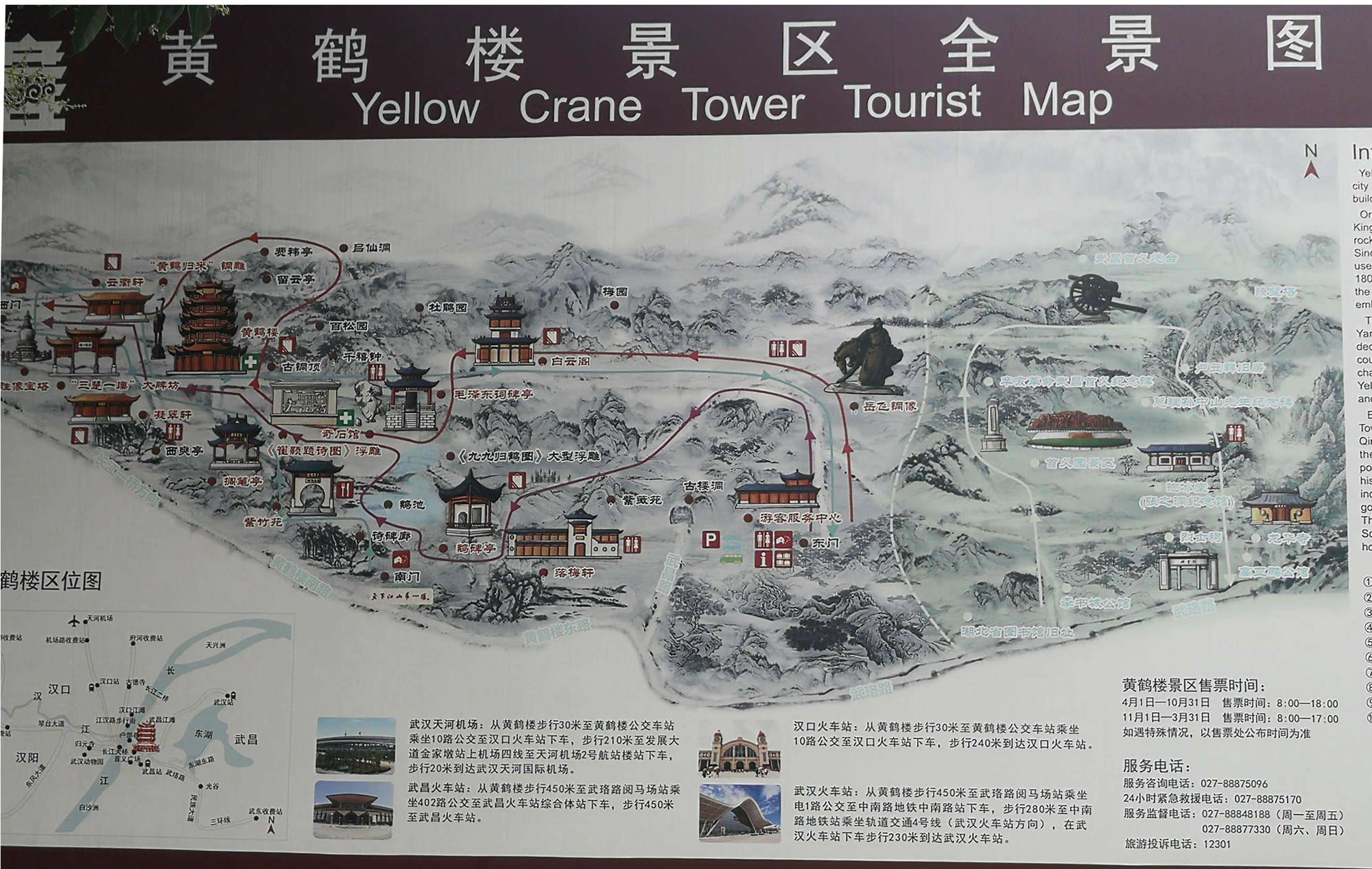 塔、碑廊、山門等建筑。整個建筑具有獨特的民族風格。黃鶴樓內部,層層風格不相同。底層為一高大寬敞的大廳,其正中藻井高達10多米,正面壁上為一幅巨大的“白云黃鶴”陶瓷壁畫,兩旁立柱上懸掛著長達7米的楹聯:爽氣西來,云霧掃開天地撼;大江東去,波濤洗凈古今愁。二樓大廳正面墻上,有用大理石鐫刻的唐代閻伯瑾撰寫的《黃鶴樓記》,它記述了黃鶴樓興廢沿革和名人軼事;樓記兩側為兩幅壁畫,一幅是“孫權筑城”,形象地說明黃鶴樓和武昌城相繼誕生的歷史;另一幅是“周瑜設宴”,反映三國名人去黃鶴樓的活動。三樓大廳的壁畫為唐宋名人的“繡像畫”,如崔顥、李白、白居易等,也摘錄了他們吟詠黃鶴樓的名句。四樓大廳用屏風分割幾個小廳,內置當代名人字畫,供游客欣賞、選購。頂層大廳有《長江萬里圖》等長卷、壁畫!