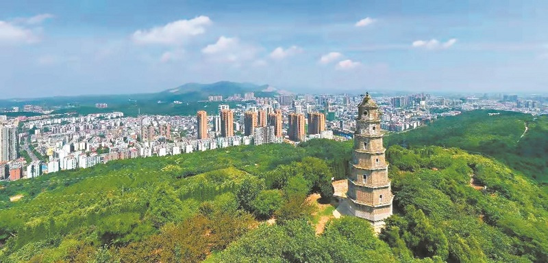 東寶塔是荊門(mén)今存的唯一一處具有千年歷史的地面文物,建于隋開(kāi)皇十三年(公元593年)。寶塔通高33.3米,底部周長(zhǎng)30.6米,七層四面八角,隔面設(shè)窗,攢尖式塔頂。塔基座周長(zhǎng)31.2米,高0.76米;隙加惺殢涀殢涀私歉鞯褚蛔鹜兴饎。底層門(mén)楣有石刻“長(zhǎng)林頭角”四字,自底層有螺旋狀青石階梯上塔頂(海拔260米)。