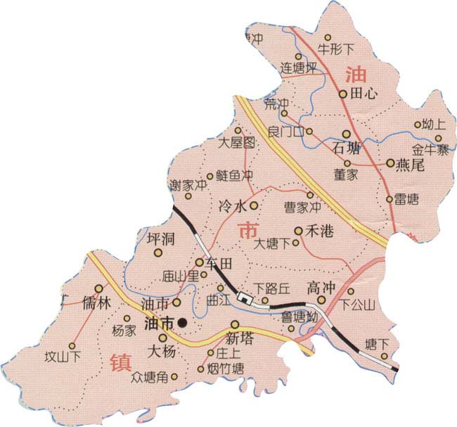 油市鎮(zhèn)行政區(qū)劃圖 油市鎮(zhèn)位于永興縣西部,東與湘陰渡鎮(zhèn)交界,海拔高度:123米。西與高亭、洋塘鄉(xiāng)毗鄰,北與復和鄉(xiāng)相連,南與蘇仙區(qū)廖王坪鄉(xiāng)接壤。 油市鎮(zhèn)下轄儒林、大揚、油市、坪洞、車田、冷水、新塔、高沖、禾巷、石塘、田心、燕尾12個行政村和1個居委會,人口29021人,總面積為42.6平方公里。京廣鐵路、京珠高速、107國道、S212省道貫穿全鎮(zhèn),交通十分便利。 |