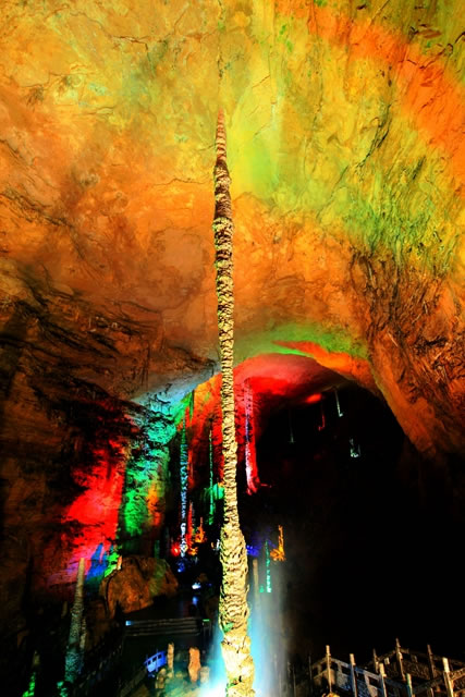 雪松是龍宮的第三大奇觀,也是黃龍洞內(nèi)生長速度最快的一根石筍,它通體雪白,高達(dá)17米,巍然聳立在龍宮大廳西端的斜坡上,“大雪壓青松,青松挺且直”就是它的真實(shí)寫照。“雪松”的科學(xué)名稱叫棕櫚狀石筍,是洞頂?shù)嗡捌洚a(chǎn)生的飛濺水共同作用的結(jié)果,一般只有在空間較為高大的廳堂才能看到。根據(jù)其根部的棕櫚片取樣分析,“雪松”挺立在這里已經(jīng)有9.6萬年的時間了,因此也叫它“萬歲松”。