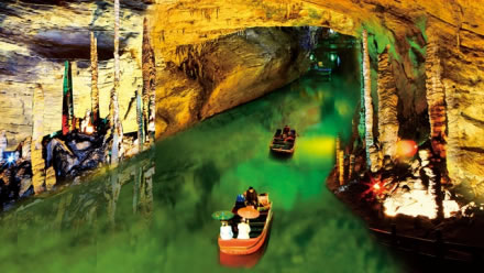 響水河是黃龍洞內(nèi)三條地下陰河中的一條,位于第二層。它全長2800米,平均水深平6米,最深處有12米,目前乘船游覽其中的一段為800米,時間約8分鐘左右。響水河平均水溫常年在攝氏16度左右,盛產(chǎn)國家二級保護(hù)動物娃娃魚和通體透明的“玻璃魚”。蕩舟響水河,沿途充滿神秘誘惑的風(fēng)景,如龍王金盔、海螺吹天等景點(diǎn)都值得您慢慢欣賞和品味?展扔腻,岸危穹高。忽仰忽傾,若明若暗,恍若回到混沌的遠(yuǎn)古時代。1992年聯(lián)合國世界自然遺產(chǎn)專家盧卡思考察響水河時,稱贊道:“黃龍洞是我見到的最漂亮的溶洞,還有這么美的陰河,真是不可思議!”
