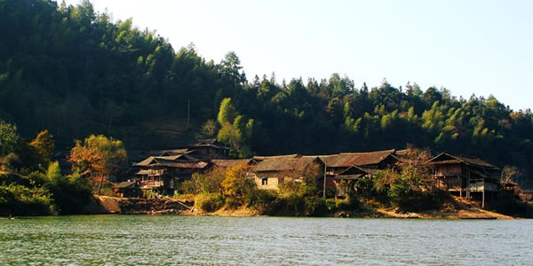 苗族寨落大多依山傍水,或在山?jīng)_,或在溪畔。村前寨后,喜植楓、椿、樟、梧,雜以棕櫚崐修竹。住宅大多為木結(jié)構(gòu)建筑。其中雙層重檐木質(zhì)卯榫結(jié)構(gòu)的吊腳樓最有特色。吊腳樓下空間為牲畜圈、灰屋和廁所,一樓為住所,二樓為放置糧食等物的倉庫,一般四排三間,一正一橫;也有的六排五間,一正兩橫。一樓面前有較寬的走廊,連接中堂與橫屋。走廊靠檐邊裝有帶靠背的長條板凳。