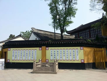 藏經(jīng)樓系原來收藏陳放經(jīng)書處,面闊3間,寬9.8米;進(jìn)深9.2米。藏經(jīng)樓樓屋頂有《西游記》中孫悟空、唐僧、豬八戒、沙悟凈的雕塑像。一樓內(nèi)墻壁上嵌有《金剛般若波羅蜜經(jīng)》的經(jīng)文(系禪宗)。還嵌有董其昌(1555一1636年,上海松江人,明代杰出的書畫家)等人的書法碑刻。鐘樓為二層,八角。樓下石碑為重修寒山寺時(shí)所立,正面碑文為程德全所撰,碑的背面刻有重修寒山寺時(shí)募捐者的名字和金錢額。傳說張繼詩中的鐘就是懸于原來這里的鐘樓樓上。鐘樓建筑和這里的鐘都不是唐代的了,這口鐘是清代光緒三十二年(1906年)重鑄的,距今有100多年的歷史。月落烏啼霜滿天,江楓漁火對(duì)愁眠。姑蘇城外寒山寺,夜半鐘聲到客船!边@是唐代詩人張繼寫的。傳說詩人張繼去唐時(shí)首都長(zhǎng)安(今西安)赴考后,落第返回時(shí),途經(jīng)寒山寺,夜泊于楓橋附近的客船中,夜里難以成眠,聽到寒山寺傳來的鐘聲,有感而作!稐鳂蛞共础吩娫谌毡編缀跫矣鲬魰。日本的小學(xué)生把這首詩作為課文來講授和背誦。