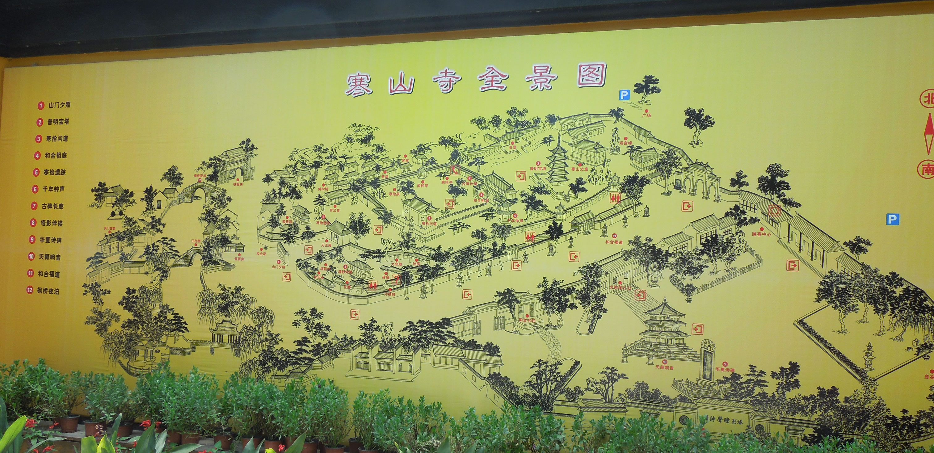寒山寺的主庭園左側(cè)的花壇兩面嵌長(zhǎng)條石刻兩塊,一為明代崇幀年間刻的"寒拾遺蹤";另一刻清末江蘇巡撫程德全寫的"妙利宗風(fēng)"。出大雄寶殿,左通普明寶塔和方丈室,右達(dá)名聞遐邇的聽"夜半鐘聲"的鐘樓,正前方的兩層屋宇是藏經(jīng)樓。遠(yuǎn)望屋頂,可見唐僧、孫悟空等西天取經(jīng)塑像群。藏經(jīng)樓樓上秘藏珍貴佛經(jīng),樓下叫"寒拾殿",寒拾殿后墻的背面立一巨碑,刻著千手千眼觀音、韋馱和關(guān)公等人物。鐘樓就在寒拾殿旁。